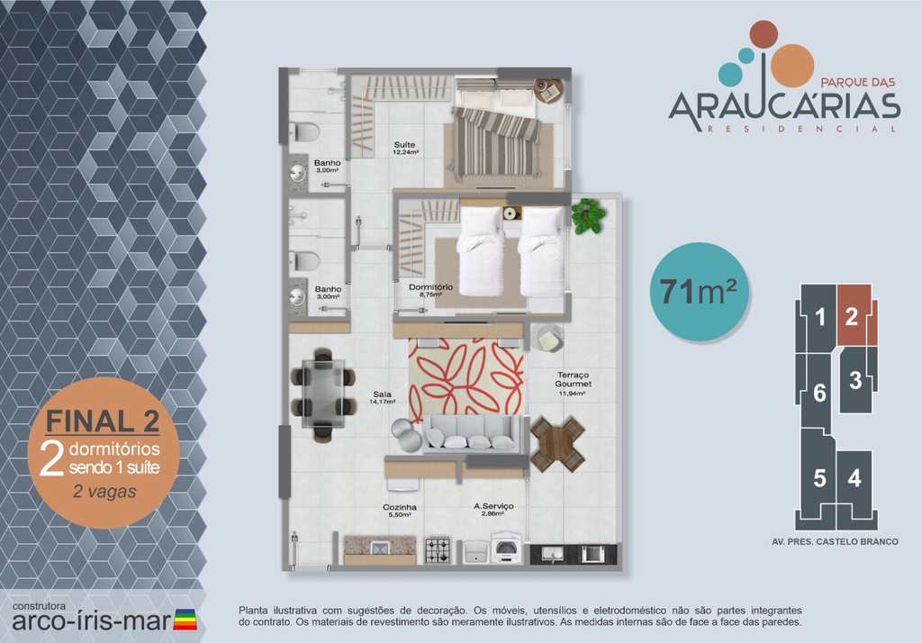 Metragem: Unidades com área útil otimizada (aprox. 69m² a 73m²), garantindo baixa manutenção e alto conforto.