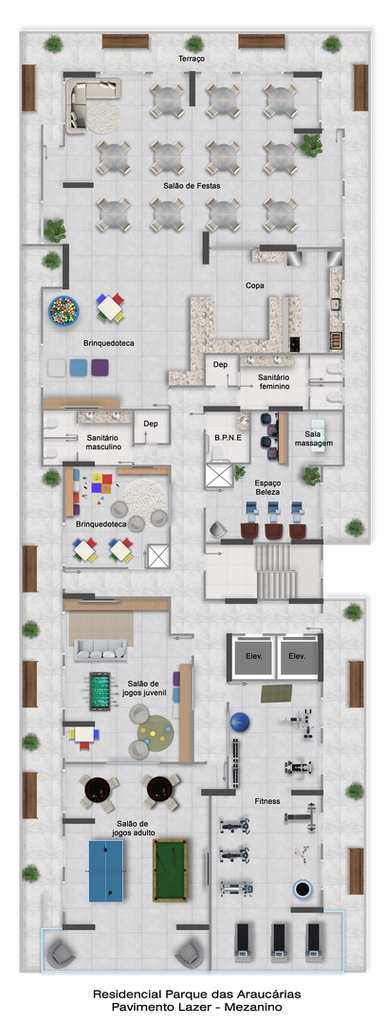 O Parque das Araucárias não é apenas um prédio, é um estilo de vida. Com lazer dividido entre o Mezanino e a Cobertura (Rooftop), você terá: